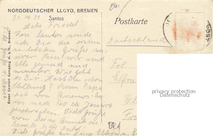 74010758 old postcard Santos Sao Paulo Brazil Stadtpanorama Schiffsreise Norddeutscher Llyod Bremen postalisch gelaufen Erhaltung siehe scans [FriedD77] KatCode: 17040