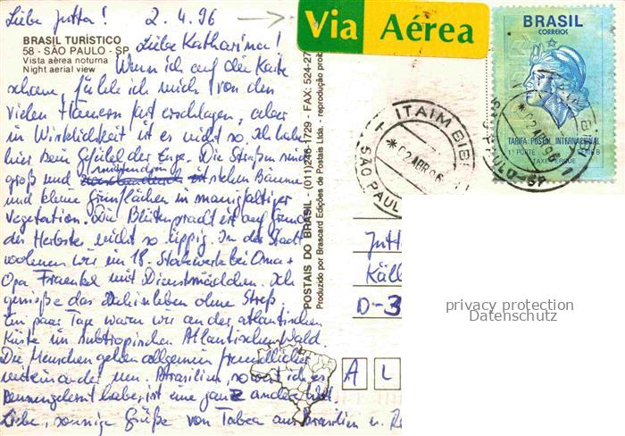 74040380 old postcard SAO PAULO Brazil Vista aérea noturna postalisch gelaufen Fliegeraufnahme Erhaltung siehe scans [FriedD77] KatCode: 17040
