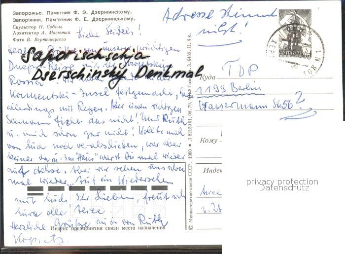 old postcard Saporischschja Dserschinsky Denkmal postalisch gelaufen Erhaltung siehe scans