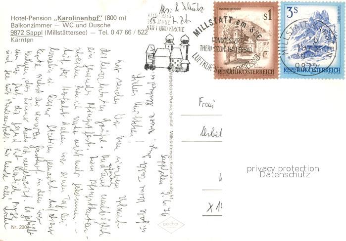 72942763 alte Postkarte Sappl Millstaettersee Hotel-Pension Karolinenhof postalisch gelaufen Erhaltung siehe scans [PaolaD17] KatCode: 11390