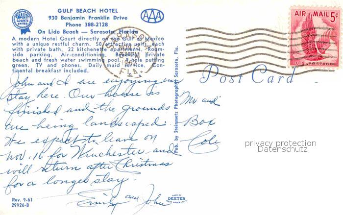 72789062 old postcard Sarasota Gulf Beach Hotel Lido Beach postalisch gelaufen Erhaltung siehe scans [FriedD77] KatCode: 14140110000000