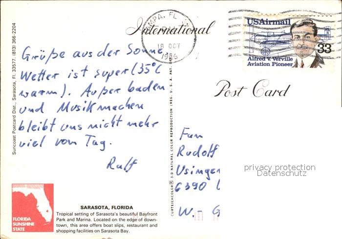 72444706 old postcard Sarasota Island Park and Marina postalisch gelaufen Erhaltung siehe scans KatCode: 14140110000000
