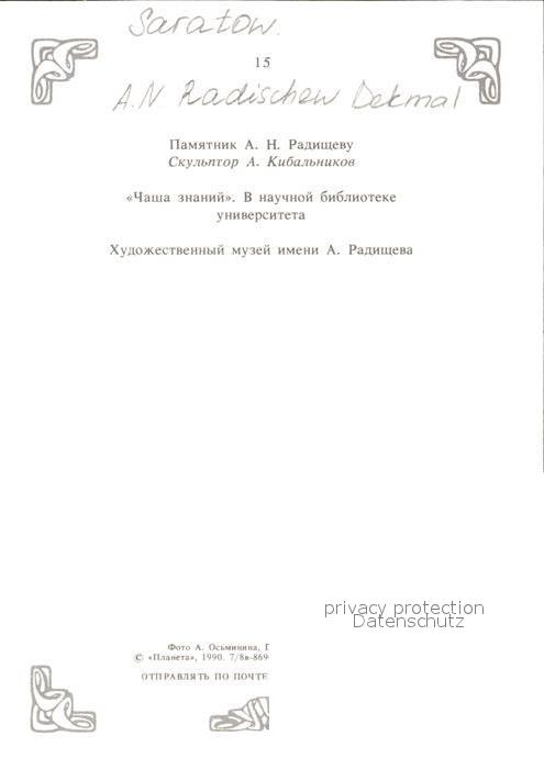Saratow AN Radischew Denkmal postalisch nicht gelaufen Erhaltung siehe scans