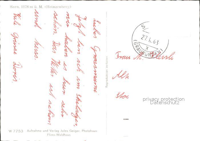 11651419 alte Postkarte Sarn Hinterrhein mit Heinzenberg postalisch gelaufen Erhaltung siehe scans KatCode: 11470100315084