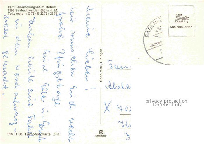 74100245 Sasbachwalden Achern Ortenaukreis BW Familienerholungsheim Hohritt postalisch gelaufen Erhaltung siehe scans [FriedD77] alte Postkarte Frie Katcode 11110008317118