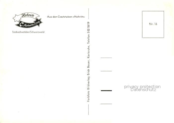 73609045 Sasbachwalden Aus den Gaststuben Hohritt postalisch nicht gelaufen Erhaltung siehe scans [WerneD78] KatCode: 11110008317118