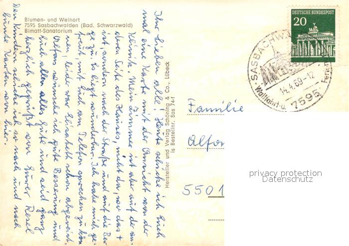 72989591 alte Postkarte Sasbachwalden Bimatt Sanatorium postalisch gelaufen Erhaltung siehe scans [WerneD78] KatCode: 11110008317118