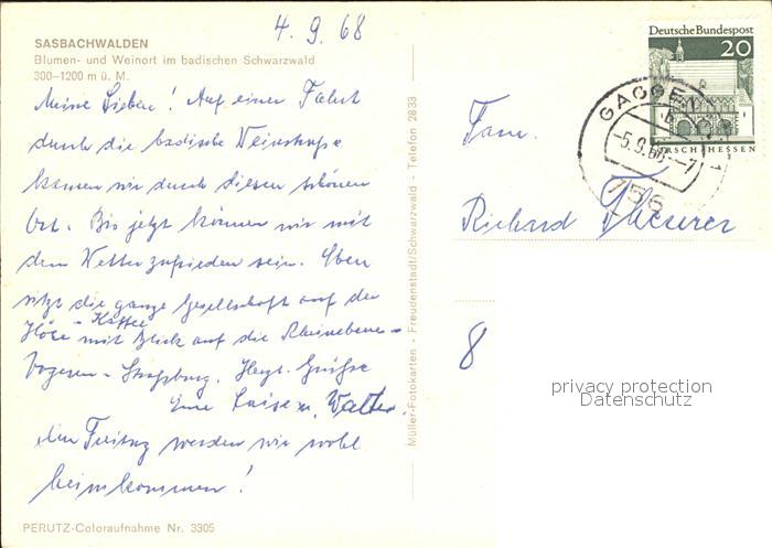 72470623 alte Postkarte Sasbachwalden Blumen und Weinort im Schwarzwald Ortspartie Fachwerkhaeuser postalisch gelaufen Erhaltung siehe scans KatCode: 11110008317118