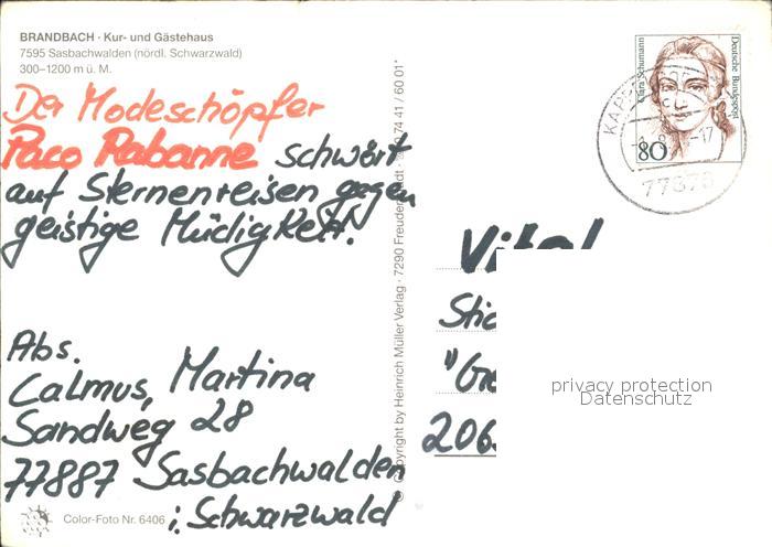 72322345 alte Postkarte Sasbachwalden Brandbach postalisch gelaufen Erhaltung siehe scans KatCode: 11110008317118