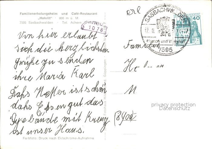 72296869 alte Postkarte Sasbachwalden Familienerholungsheim Cafe Restaurant Hohritt postalisch gelaufen Erhaltung siehe scans KatCode: 11110008317118