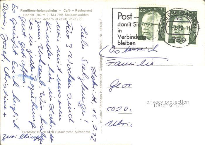 72504438 alte Postkarte Sasbachwalden Familienerholungsheim postalisch gelaufen Erhaltung siehe scans KatCode: 11110008317118