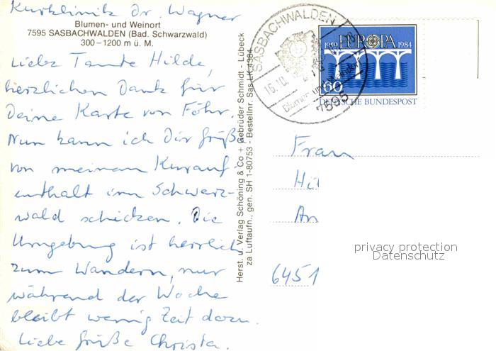 72772586 alte Postkarte Sasbachwalden Fliegeraufnahme postalisch gelaufen Erhaltung siehe scans [AndreD76] KatCode: 11110008317118