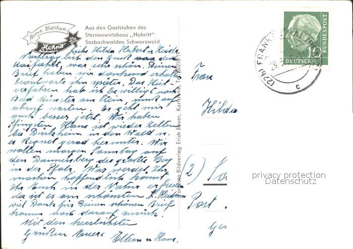 72238382 alte Postkarte Sasbachwalden Gaststuben Sternenwirtshaus Hohritt postalisch gelaufen Erhaltung siehe scans KatCode: 11110008317118