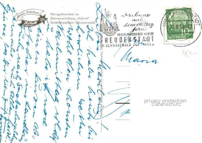 73129671 alte Postkarte Sasbachwalden Herrgottswinkel Sternenwirtshaus Hohritt postalisch gelaufen Erhaltung siehe scans [NatalD47] KatCode: 11110008317118