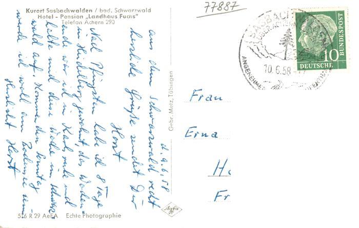73940291 alte Postkarte Sasbachwalden Hotel Pension Landhaus Fuchs postalisch gelaufen Erhaltung siehe scans [WerneD78] KatCode: 11110008317118