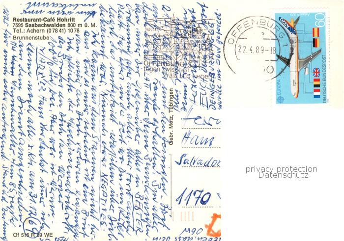 73753375 alte Postkarte Sasbachwalden Restaurant Cafe Hohritt Brunnenstube postalisch gelaufen Erhaltung siehe scans [WerneD78] KatCode: 11110008317118