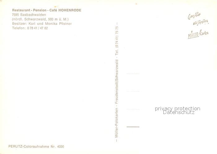 73169160 Sasbachwalden Restaurant Pension Hohenrode postalisch nicht gelaufen Erhaltung siehe scans [KathaD81] KatCode: 11110008317118