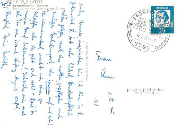 73668806 alte Postkarte Sasbachwalden Sanatorium Dr Wagner postalisch gelaufen Erhaltung siehe scans [WerneD78] KatCode: 11110008317118