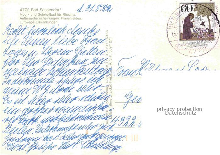 74156916 alte Postkarte Sassendorf Bad Moor-Soleheilbad Rheuma Kurort Kirche Wohngebiet Felder Wald postalisch gelaufen Fliegeraufnahme Erhaltung siehe scans [Karloger] KatCode: 11110005974008
