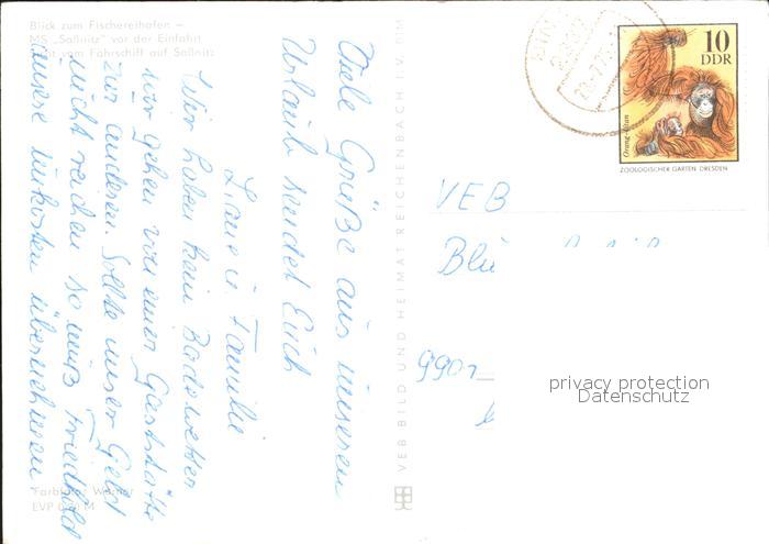72383332 alte Postkarte Sassnitz Ostseebad Ruegen Faehrschiff Fischereihafen postalisch gelaufen Erhaltung siehe scans KatCode: 11110013061035
