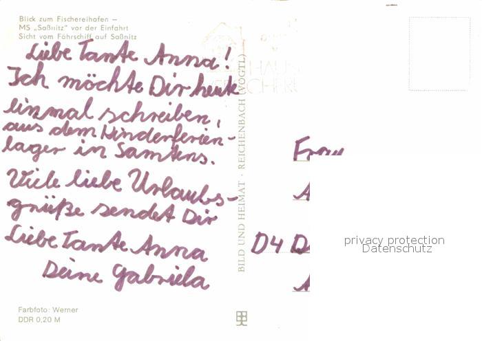 72729847 alte Postkarte Sassnitz Ostseebad Ruegen Fischerreihafen Personenschiff Sassnitz postalisch gelaufen Erhaltung siehe scans [AndreD76] KatCode: 11110013061035