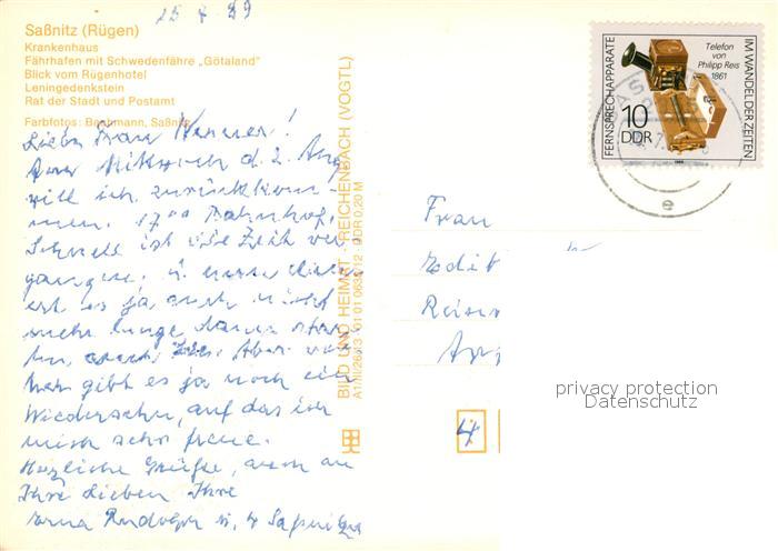 73071394 alte Postkarte Sassnitz Ostseebad Ruegen Krankenhaus Faehrhaufen Schwedenfaehre Goetaland Rat der Stadt Postamt postalisch gelaufen Erhaltung siehe scans [NatalD47] KatCode: 11110013061035