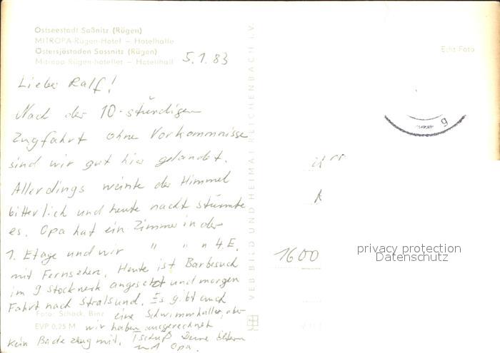 72055339 alte Postkarte Sassnitz Ostseebad Ruegen Mitropa Ruegen Hotel Hotelhalle postalisch gelaufen Erhaltung siehe scans KatCode: 11110013061035
