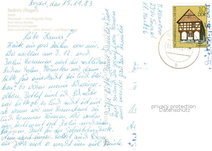 73655146 alte Postkarte Sassnitz Ostseebad Ruegen Stele Neustadt Ruegener Ring Karl Marx Strasse Stubnitz Lichtspiele Seemannsheim Ruegenhotel postalisch gelaufen Erhaltung siehe scans [FriedD77] KatCode: 11110013061035