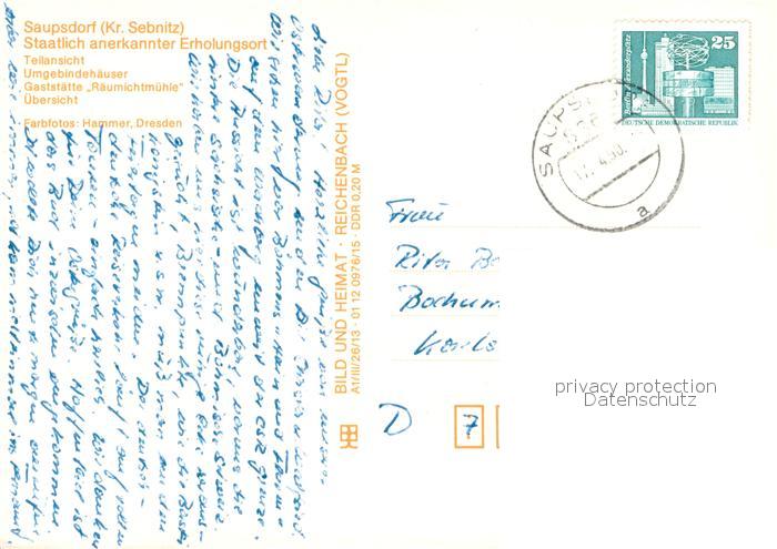 73653182 alte Postkarte Saupsdorf Ortsansichten Panorama Umgebindehaus Fachwerkhaus Gaststaette Raeumichtmuehle postalisch gelaufen Erhaltung siehe scans [FriedD77] KatCode: 11110014287180