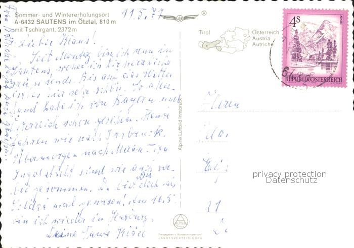 72496222 alte Postkarte Sautens mit Tschirgant Fliegeraufnahme postalisch gelaufen Erhaltung siehe scans KatCode: 11390334070218