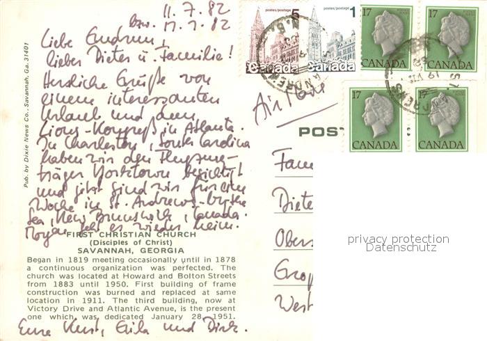 73628192 old postcard Savannah Georgia First Christian Church postalisch gelaufen Erhaltung siehe scans [WerneD78] KatCode: 14140120000000
