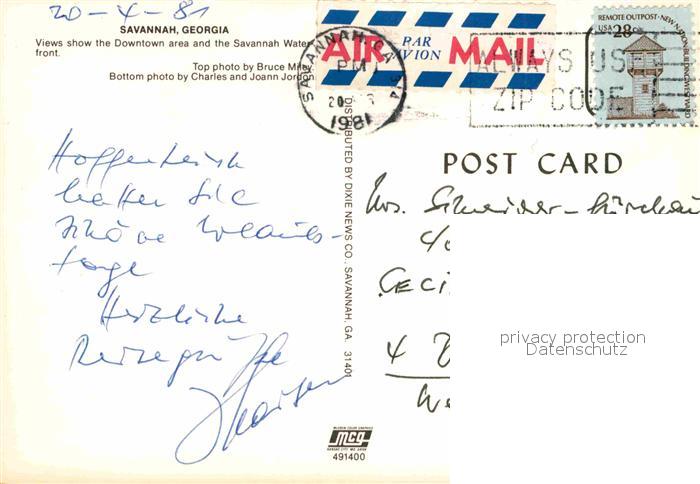 72897239 old postcard Savannah Georgia Gesamtansicht Promenade postalisch gelaufen Erhaltung siehe scans [AndreD76] KatCode: 14140120000000