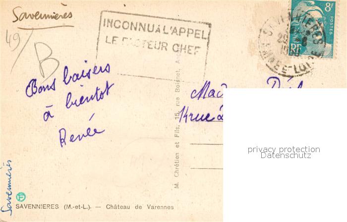 13539837 carte postale Savennieres Chateau de Varennes postalisch gelaufen Erhaltung siehe scans [FriedD77] KatCode: 11170049149329