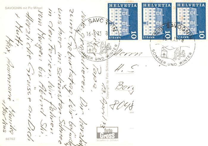 13919425 alte Postkarte Savognin Savognino GR mit Piz Mitgel Ortspartie mit Pferdeschlitten postalisch gelaufen Erhaltung siehe scans [FriedD77] KatCode: 11470100305966