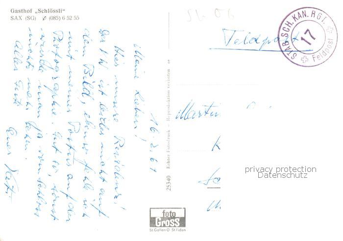13851799 alte Postkarte Sax SG Gasthof Schloessli Alpen postalisch gelaufen Feldpost – Stempel Erhaltung siehe scans [FriedD77] KatCode: 11470190590862