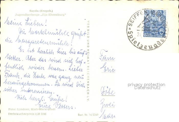72475424 alte Postkarte Sayda Jugendherberge Ilja Ehrenburg postalisch gelaufen Erhaltung siehe scans KatCode: 11110014177380