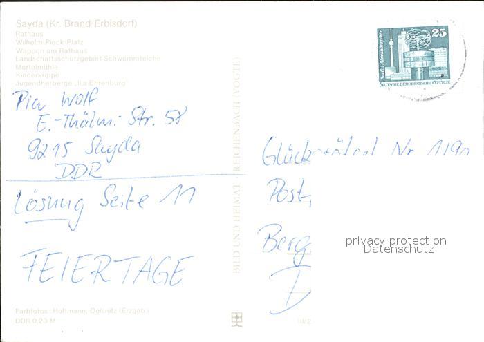 72401280 alte Postkarte Sayda Rathaus Wappen Mortelmuehle Kinderkrippe Wilhelm Pieck Platz postalisch gelaufen Erhaltung siehe scans KatCode: 11110014177380