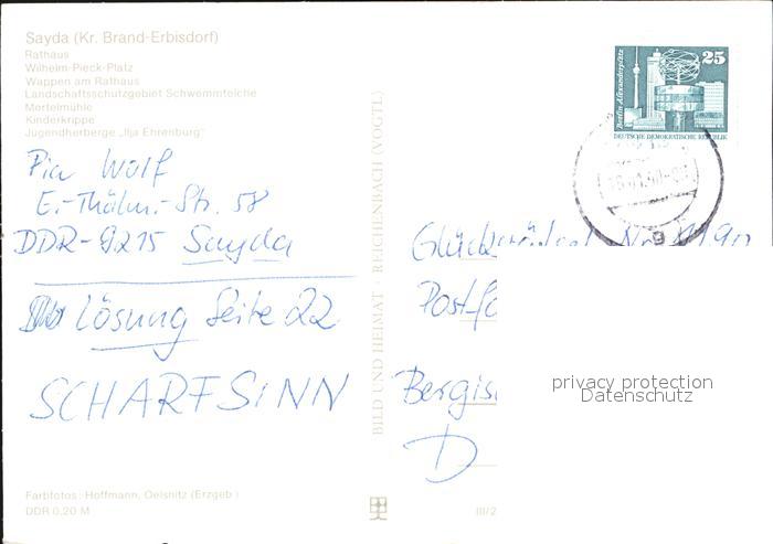 72461696 alte Postkarte Sayda Rathaus Wilhelm Pieck Platz Wappen Rathaus Kinderkrippe postalisch gelaufen Erhaltung siehe scans KatCode: 11110014177380