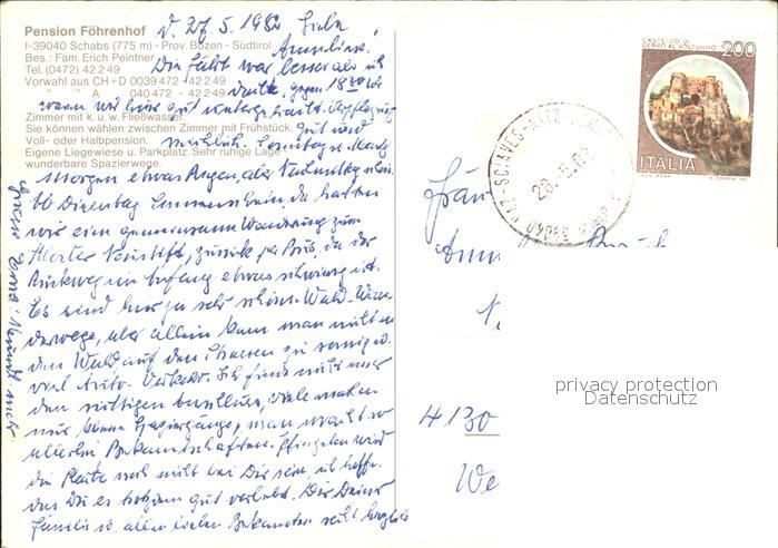 old postcard Schabs Pension Foehrenhof postalisch gelaufen