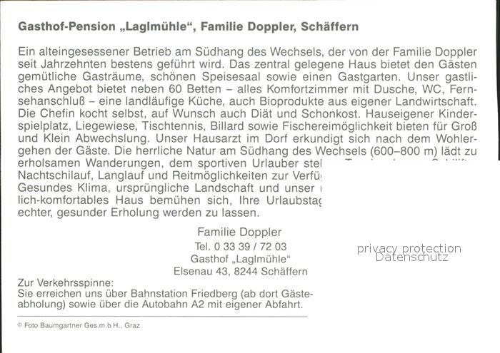 72139812 Schaeffern Gasthof Pension Laglmuehle Panorama Landschaft postalisch nicht gelaufen Werbekarte (keine Postkarte) Erhaltung siehe scans KatCode: 11390224060736