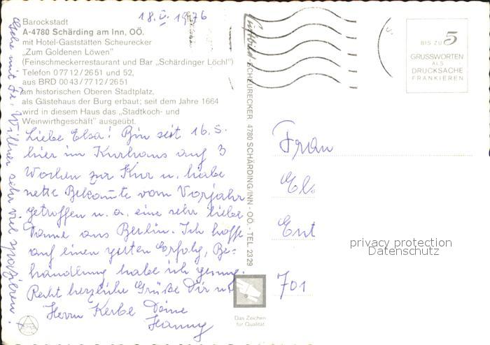 72540604 alte Postkarte Schaerding Barockstadt Hotel Restaurant Scheunecker Zum Goldenen Loewen postalisch gelaufen Erhaltung siehe scans [LiesaD40 kt122box] KatCode: 11390311041422