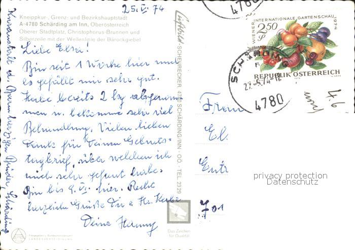 72536708 alte Postkarte Schaerding Oberer Stadtplatz Christopherus Brunnen postalisch gelaufen Erhaltung siehe scans [AndreD76 kt121box] KatCode: 11390311041422