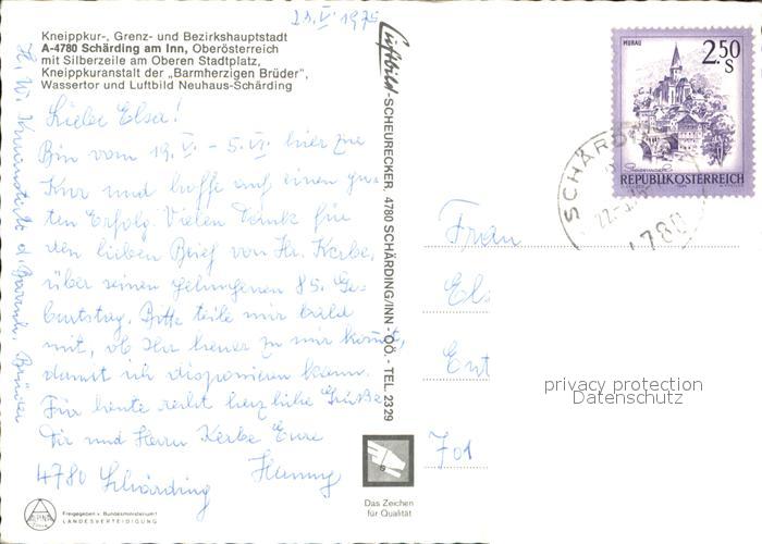 72543353 alte Postkarte Schaerding Silberzeile am Stadtplatz Kneippkuranstalt der Barmherzigen Brueder Wassertor Fliegeraufnahme postalisch gelaufen Erhaltung siehe scans [WerneD78 kv016box] KatCode: 11390311041422