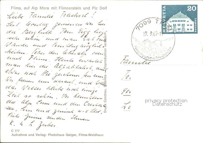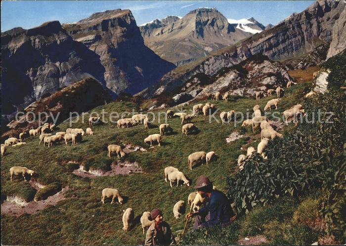 alte Postkarte Schafe Hirte Flims Alp Mora Flimserstein Piz Dolf postalisch gelaufen