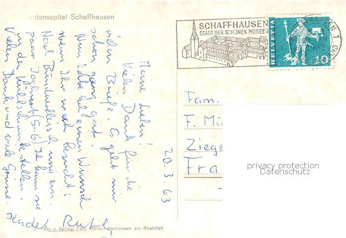 13858211 alte Postkarte Schaffhausen SH Kantonsspital postalisch gelaufen Erhaltung siehe scans [FriedD77] KatCode: 11470160460372