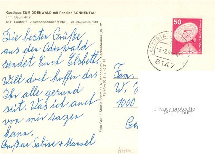 73649214 alte Postkarte Schannenbach Gasthaus Pension Zum Odenwald postalisch gelaufen Erhaltung siehe scans [FriedD77] KatCode: 11110006431014