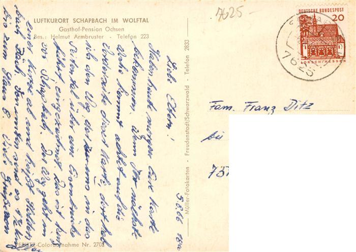 73930404 alte Postkarte Schapbach Gasthof Pension Ochsen im Wolftal postalisch gelaufen Erhaltung siehe scans [FriedD77] KatCode: 11110008237075
