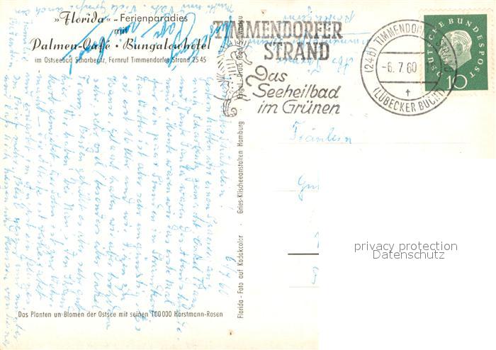 73745397 alte Postkarte Scharbeutz Ostseebad Florida Ferienparadies Palmen Cafe Bungalowhotel postalisch gelaufen Erhaltung siehe scans [WerneD78] KatCode: 11110001055044
