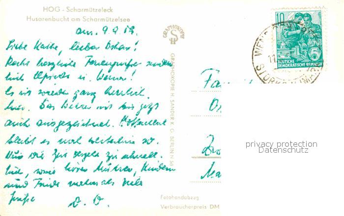 72729516 alte Postkarte Scharmuetzelsee HOG Scharmuetzeleck Gaststaette Husarenbucht postalisch gelaufen Erhaltung siehe scans [FriedD77] KatCode: 11110012067024