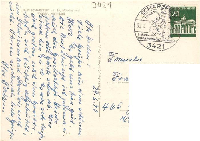 73871276 alte Postkarte Scharzfeld mit Steinkirche und Waldschwimmbad Panorama postalisch gelaufen Erhaltung siehe scans [FriedD77] KatCode: 11110003156009